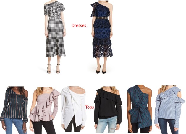 A plain shirt doubles as a skirt; strapless blouse; off shoulder; and even a one shoulder.